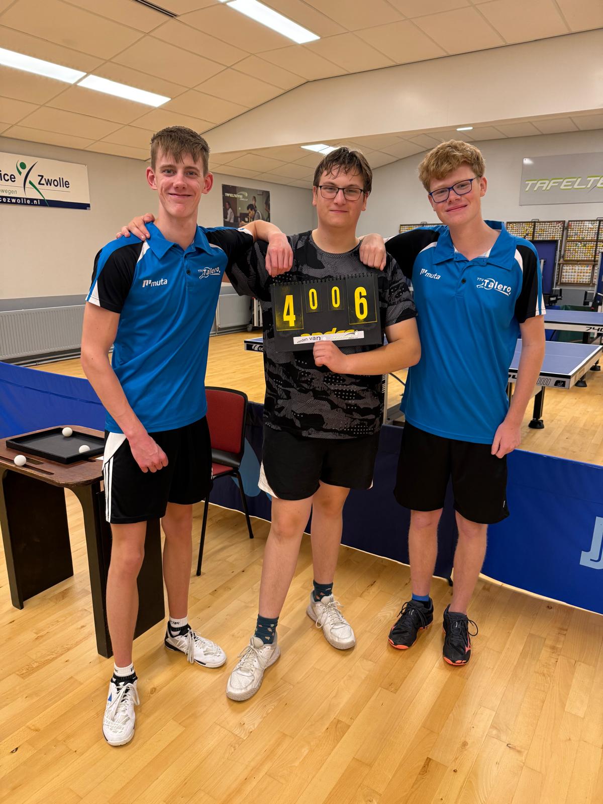 Mede door een ontketende Dathan Dijksma won het op landelijk C-niveau acterende eerste jeugdteam van ttv Talero met 4-6 van het iets hoger geklasseerde Tafeltennis Zwolle 3. Dathan bleef met drie overwinningen ongeslagen en won ook nog samen met Mathijs Boer het dubbel. De uitslag had nog groter kunnen uitvallen als Mathijs Boer niet geblesseerd was uitgevallen. Een enkelblessure speelt hem al langere tijd parten. Belangrijk voor deze overwinning was ook dat Ruben Talen de openingswedstrijd won door drie spannende games naar zich toe te trekken.